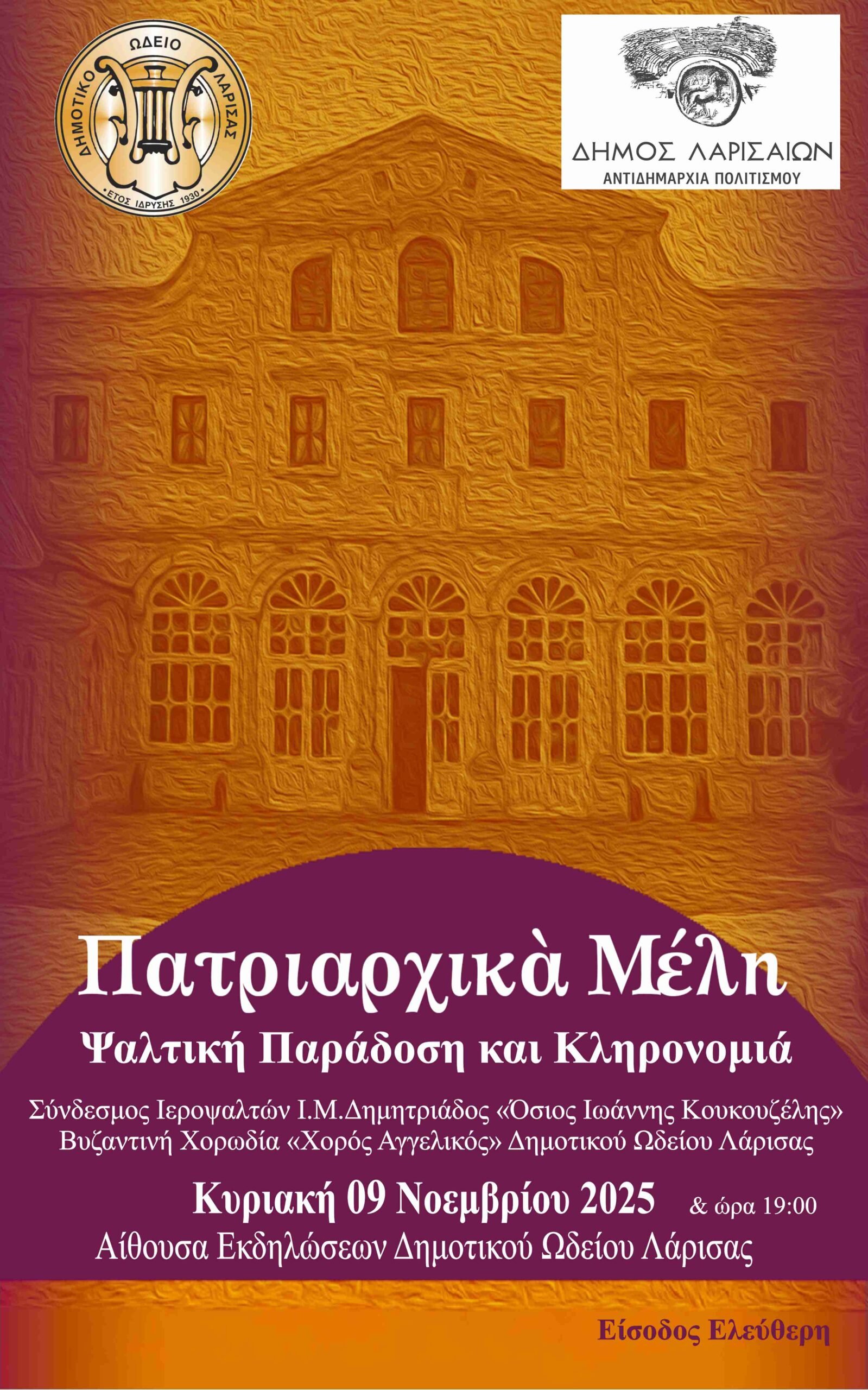 Εκδήλωση του Δημοτικού Ωδείου Λάρισας για την ψαλτική παράδοση του Οικουμενικού Πατριαρχείου.