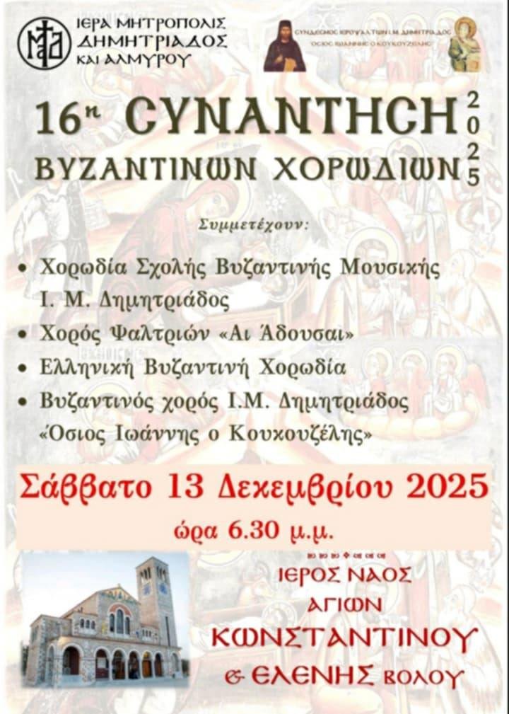 Ἡ 16η Συνάντηση Βυζαντινῶν Χορωδιῶν, ποὺ διοργανώνει ὁ Σύνδεσμος ἹεροψαλτῶνΙ.Μ.
